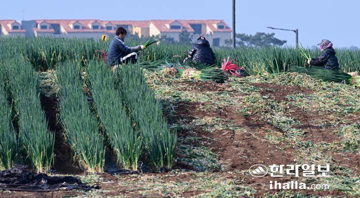 대파 수확하는 제주 농민들