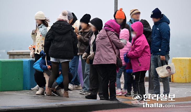 [한라일보] 2일 제주시 도두동 무지개해안도로를 찾은 관광객들이 바닷바람을 온몸으로 맞고 있다. 강희만기자