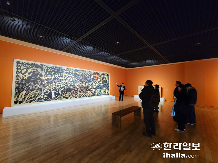 | 지난달 12일 제주도립미술관 기획전시실에서 열리고 있는 제주와 일본 아오모리현 국제교류전 '바람과 숲의 대화'에서 이종후 제주도립미술관장이 일본 아오모리를 대표하는 판화가 '무나카타 시코'의 작품에 대해 설명하고 있다. 박소정기자 |