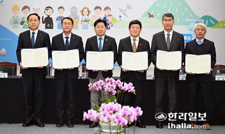 제주특별자치도와 제주도교육청은 4일 오후 제주도청 탐라홀에서 제주대학교, 두산에너빌리티, 제주에너지공사, 서귀산과고와 '제주형 협약고등학교(에너지 분야) 운영'을 위한 업무협약을 체결했다.