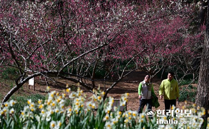 [한라일보] 입춘인 4일 제주시 한림공원 매화정원을 찾은 탐방객들이 매화꽃향을 맡으며 남국의 정취를 만끽하고 있다. 강희만기자