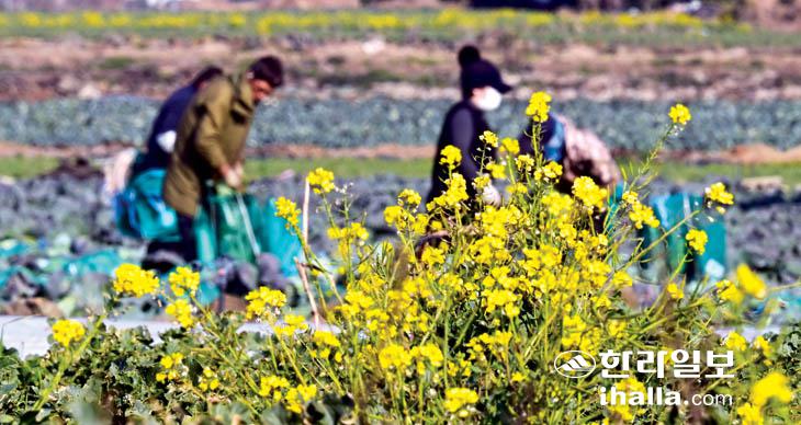 [한라일보] 5일 서귀포시 대정읍 하모리 농경지에서 농민들이 유채꽃 너머에서 양배추 수확작업을 하고 있다. 강희만기자