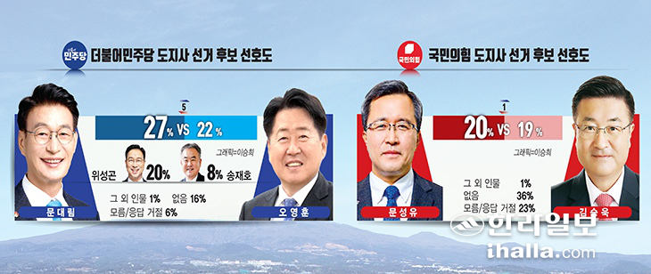 [한라일보] 제주특별자치도지사 선거 후보 선호도 조사에서 오영훈 제주지사와 문대림 국회의원이 오차범위 내에서 접전을 펼치는 것으로 나타났다.