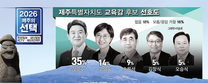 제주교육감 후보 선호도 조사에서는 김광수 현 교육감이 가장 많은 지지를 얻었다. 김 교육감은 35%의 지지율로 1위를 차지했고, 이어 고의숙 제주도의회 교육의원 14%, 송문석 전 서귀중앙여중 교장 9%, 김창식 교육의원과 오승식 교육의원 각각 5% 순이다.