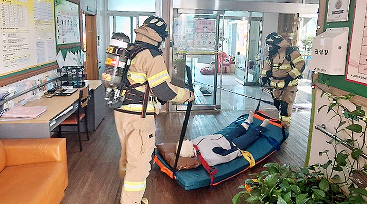 제주서부소방서(서장 고행수)는 지난 5일 서귀포시 대정읍 소재 남제주요양원에서 자위소방대와 합동으로 긴급이송시트를 활용한 피난 대피 소방훈련을 실시했다.