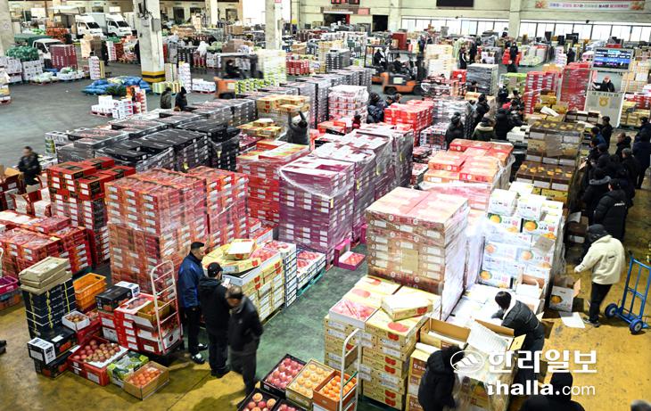[한라일보] 민족 고유 명절인 설명절을 일주일 앞둔 9일 제주시 일도2동 제주시농협 농산물공판장에서 설에 쓰일 제수용 과일들을 경매하고 있다. 강희만기자