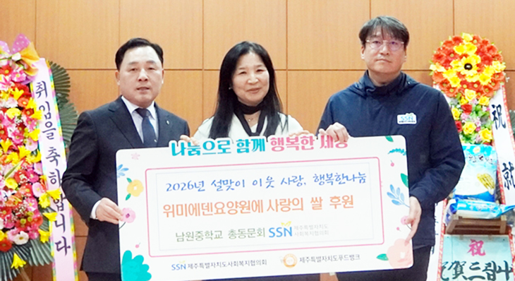 남원중학교 총동문회(회장 고권진)는 지난 7일 제주특별자치도사회복지협의회(회장 고관용)를 통해 위미에덴요양원(원장 현지은)에 이웃사랑 쌀 1000㎏을 전달했다.