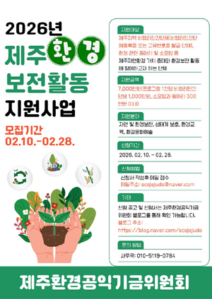 위원회는 사업계획서 등 제출서류 심사를 거쳐 최종 지원대상을 결정할 예정이다. 자세한 사항은 위원회 블로그(https://blog.naver.com/ecojejudo)에 게시된 공고를 통해 확인할 수 있으며 이외의 사항은 위원회 사무국(010-5119-0784, ecojejudo@naver.com)을 통해 문의하면 된다.