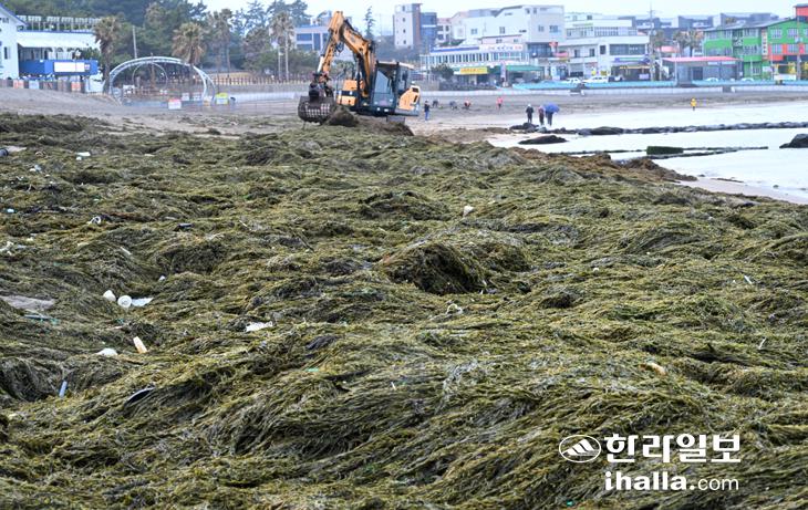 [한라일보] 10일 제주시 이호해수욕장에서 파도에 떠밀려온 엄청난 양의 괭생이모자반이 모래사장을 뒤덮은 가운데 중장비를 동원해 수거 작업을 하고 있다. 강희만기자