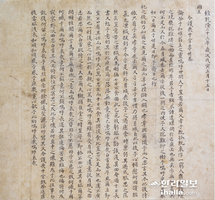 | 영조가 화순옹주를 애도한 '유제우화순옹주지령'. |