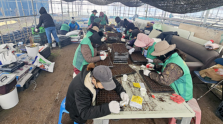 서귀포시 표선면부녀회(회장 이영순)는 지난 8일 표선면 운영 양묘장에서 도로변 꽃길 조성을 위한 봄꽃 8만본을 파종했다.