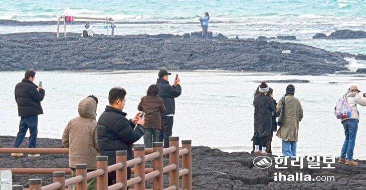 [한라일보] 11일 제주시 한림읍 협재해수욕장를 찾은 관광객들이 겨울 바다의 정취를 즐기고 있다. 강희만기자