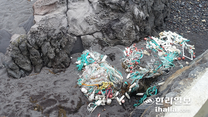 모래에 발이 푹푹 빠지며 바로 옆으로 걸음을 옮기자 몽돌들이 불균형하게 쌓여 있는 모습이었다. 군데군데 몽돌이 가파르게 쌓인 곳이 있었고 폐어구와 일반쓰레기들도 발견됐다.