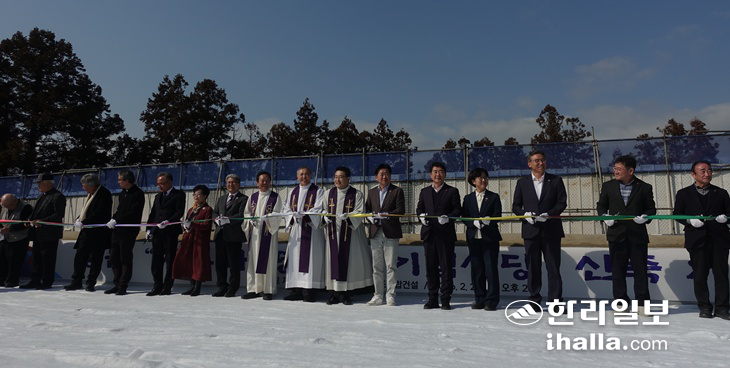 | 28일 중문 치유와 평화의 기념성당 기공식에서 테이프 커팅을 하고 있다. 진선희기자 |
