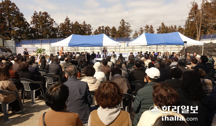 28일 오후 '중문 치유와 평화의 기념성당'(이하 기념성당) 기공식에서 천주교 제주교구 문창우 교구장은 이런 말로 강론을 마쳤다. 중문성당 신자 등 참석자들은 앞으로 새로 지어질 기념성당이 "4·3의 아픔과 고통을 치유하는 안식처"가 되길 기도했다.