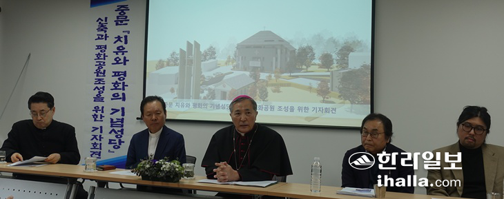 기공식에 앞서 마련된 기자회견에서 중문성당 고병수 주임신부는 "총 80억 원의 사업비가 투입될 예정"이라며 '청국장 신부'로 불리는 황창연 신부가 30억 원 상당을 기부하면서 건립 사업의 물꼬를 텄고 현재까지 1만여 명의 신자가 힘을 보태는 등 전국에서 동참의 손길이 모이고 있다고 전했다. 황창연 신부는 "4·3희생자들을 위해 기억하는 공간, 아픔이 있는 분들을 치유해주고 평화를 찾는 공간을 만드는 일에 함께할 수 있어서 큰 기쁨"이라고 말했다.