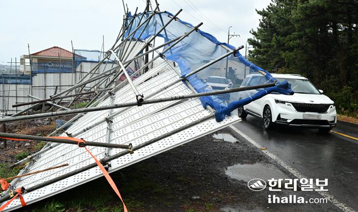 [한라일보] 제주 전역에 강풍경보가 내려진 2일 서귀포시 안덕면 산방산 인근 공사장에 설치된 안전막이 강한 바람에 못이겨 넘어져 있다. 강희만기자
