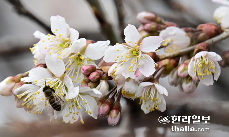 [한라일보] 초봄 날씨를 보인 3일 제주시 도두동의 한 주택가에 활짝 핀 벚꽃에 꿀벌들이 날아와 꿀을 먹고 있다. 강희만기자