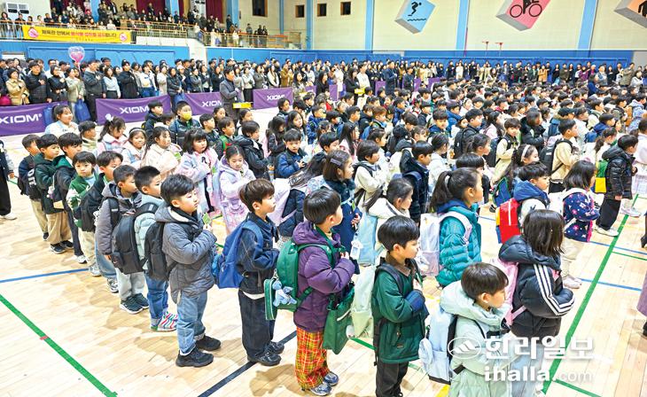 [한라일보] 초중고 입학식이 일제히 열린 3일 한라초등학교 입학생들이 국민의례를 하고 있다. 강희만기자