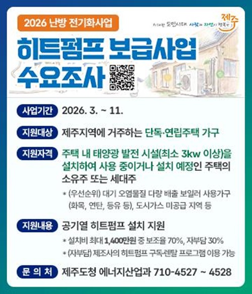 제주특별자치도는 에너지 전전화를 위한 히트펌프 보급사업에 앞서 사전 수요조사를 실시한다고 4일 밝혔다.