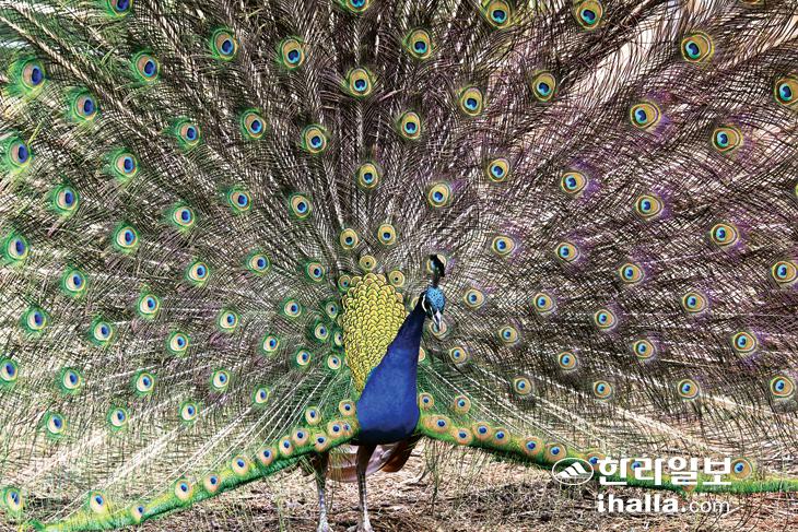 4일 제주시 한림읍 한림공원에서 수컷 공작새가 깃을 부채처럼 활짝 펼쳐 시선을 사로 잡고 있다. 강희만기자