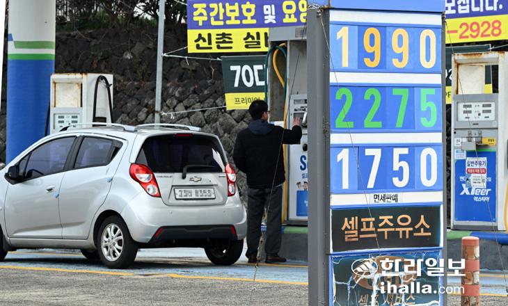 [한라일보] 중동 전쟁 여파로 국제유가(WTI)가 배럴당 90.9달러(6일 기준)로 치솟은 가운데 9일 제주시내 한 주유소에 휘발유와 경유 최고가 가격이 내걸려져 있다. 강희만기자