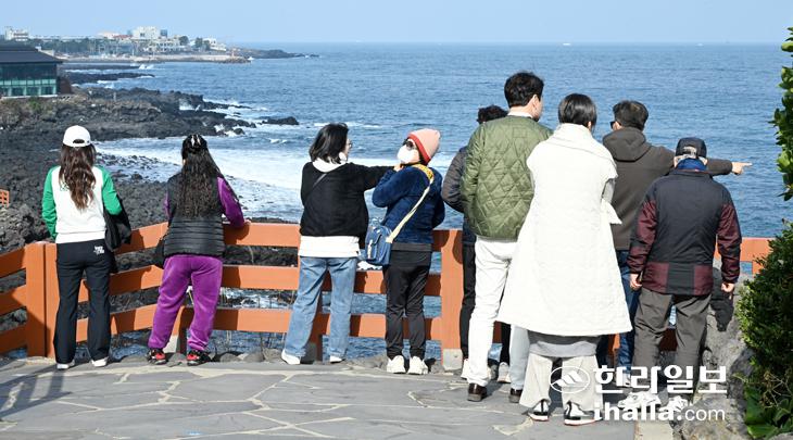 [한라일보] 10일 제주시 용담동 용두암을 찾은 관광객들이 제주의 봄바다를 바라보고 있다. 강희만기자