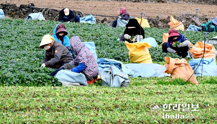 제주시 애월읍 하가리 한 농경지에서 농민들이 취나물 수확 작업. /사진=한라일보DB