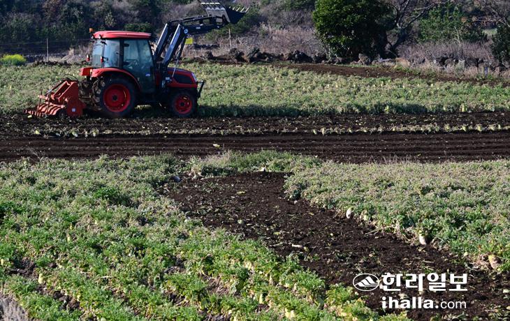 [한라일보] 14일 서귀포시 안덕면 사계리의 한 밭에서 농민이 트랙터로 월동무를 갈아엎고 있다. 강희만기자
