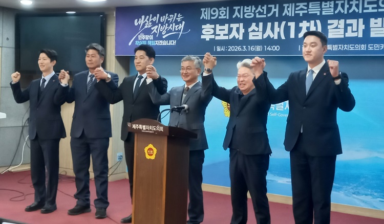 더불어민주당 제주특별자치도당 공직선거후보자추천관리위원회는 16일 제주도의회 도민카페에서 기자회견을 열고 ▷제주시 연동을 강철남 의원 ▷애월읍갑 장정훈 예비후보 ▷일도1동·이도1동·건입동 한권 의원 ▷이도2동갑 김기환 의원 ▷아라동을 정현철 예비후보 등 5명을 6·3지방선거 더불어민주당 광역의원 단수후보자로 선정했다고 밝혔다.
