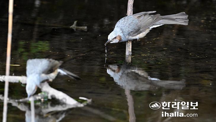 [한라일보] 16일 제주시 조천읍 조천리의 한 연못을 찾은 직박구리가 주변을 경계하며 물을 마시고 있다. 강희만기자