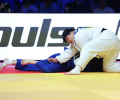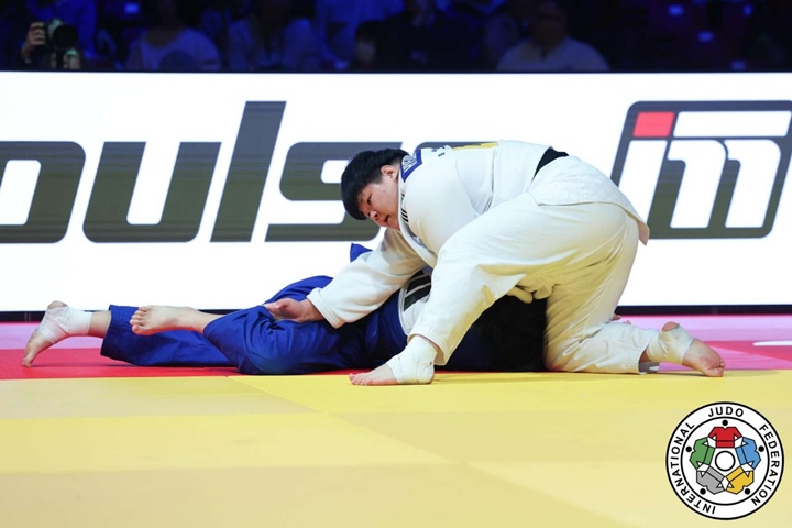 2025 국제유도연맹(IJF) 도쿄 그랜드스램 이틀째 여자 +78㎏급 결승전에서 김하윤을 상대로 조르기를 시도하는 이현지(흰색). 국제유도연맹 제공