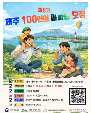 제주특별자치도와 인구보건복지협회 제주지회(회장 이용탁)는 아빠의 육아 참여 확대와 가족 간 유대 강화를 위해 '제8기 제주 100인의 아빠단' 참여자를 모집한다.