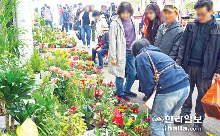 [한라일보] 17일 제주시 민속오일시장을 찾은 시민들이 화사하게 핀 봄꽃과 나무 등을 구입하고 있다. 강희만기자