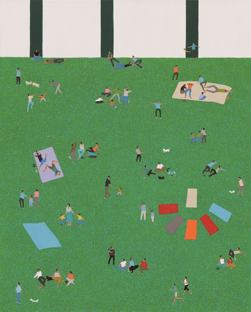 돌담갤러리에서는 '벛꽃나들이', '소원', '소원을 말해봐' 등을 선보인다. 문예회관 전시엔 '휴식' 연작 등이 나온다. 하늘 위에서 지상을 바라보는 듯한 시점의 화면에는 삼삼오오 거니는 사람들의 즐거움과 행복 등이 전해진다. 그의 그림에 배어나는 도저한 낙관은 우리들 각자의 기억 속에 가장 따듯했던 그곳이 자리하고 있기 때문인지 모른다.