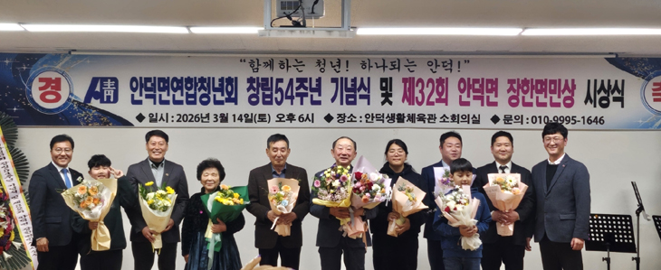 이날 시상식은 안덕면연합청년회 창립 54주년 기념행사와 함께 진행됐으며 안덕면 기관·단체장, 마을 이장, 청년회원, 지역주민 등 100여 명이 참석해 수상자들의 공적을 축하하고 격려했다.