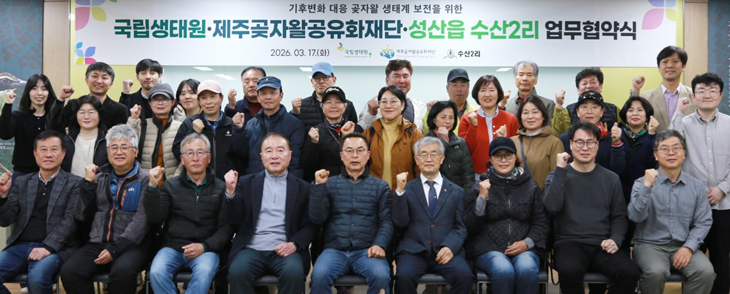 [한라일보] 환경부 산하 국립생태원(원장 이창석)과 서귀포시 성산읍 수산 2리(이장 오영삼), 제주곶자왈공유화재단(이사장 김범훈)은 지난 17일 재단에서 마을주민들이 참석한 가운데 수산곶자왈의 기후변화 대응 곶자왈 연구보전 및 교육 등 지역 공동체와의 상호 협력을 다짐하는 상생 업무협약을 체결했다.