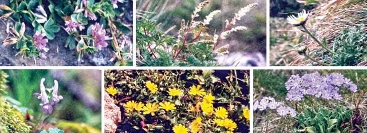 제주도 특산식물. 사진 위 왼쪽부터 제주달구지풀, 한라개승마, 한라구절초. 아래 왼쪽부터 탐라현호색, 한라고들빼기, 한라설앵초. '제주어' 수록 이미지