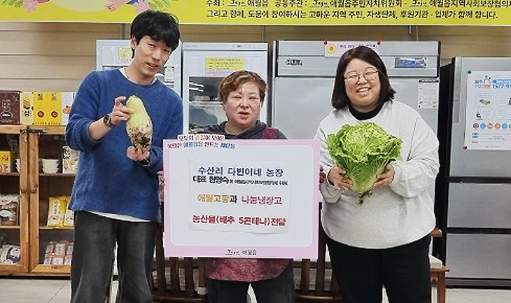 다빈이네농장(대표 현영숙)은 지난 17일 지역 내 어려운 이웃들에게 전달해 달라며 제주시 애월읍사무소(읍장 김태헌)에 직접 재배한 무와 배추를 전달했다.