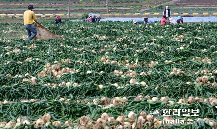 [한라일보] 22일 제주시 한경면 고산리 한 농경지에서 농민들이 양파 수확 작업을 하고 있다. 강희만기자