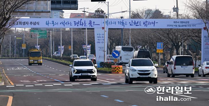 [한라일보] 제주 4·3 희생자 추념식을 10여일 앞둔 22일 제주시 평화로 진입로에 홍보 아치가 설치되어 있다. 강희만기자
