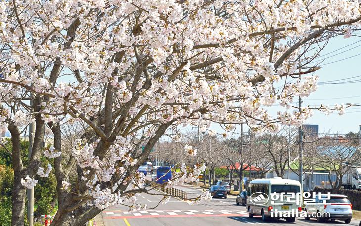 [한라일보] 완연한 봄기운을 보인 23일 서귀포시 성산읍 도로변 왕벚나무에 꽃이 활짝 펴 시선을 사로잡고 있다. 강희만기자