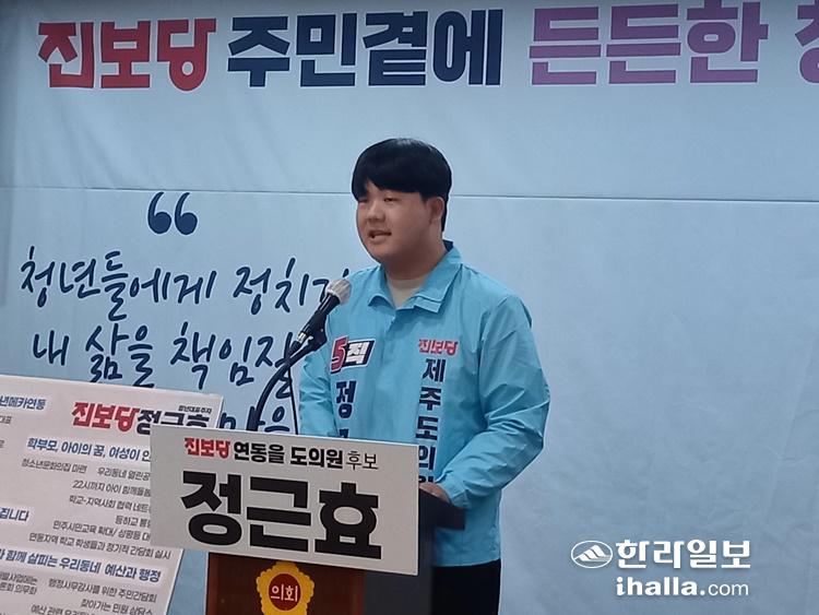 [한라일보] 제9회 전국동시지방선거 제주도의원선거에 출마하는 정근효 예비후보(진보당, 연동을)는 청년 기본 소득을 중심으로 한 '제주청년 메카 연동' 정책을 발표했다.