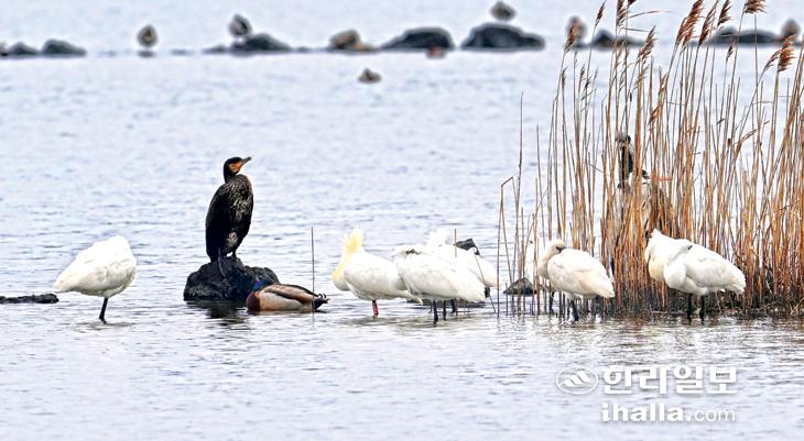[한라일보] 25일 제주시 구좌읍 하도철새도래지에서 겨울을 무사히 보낸 천연기념물 저어새들이 번식지로 돌아가기 위해 준비를 하고 있다. 강희만기자