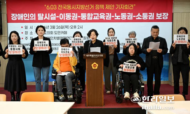 제주특별자치도 장애인차별철폐연대 준비위원회(이하 제주전장연(준))는 26일 오후 제주도의회 도민카페에서 ‘6·3 전국동시지방선거 정책 제안 기자회견’을 열었다.