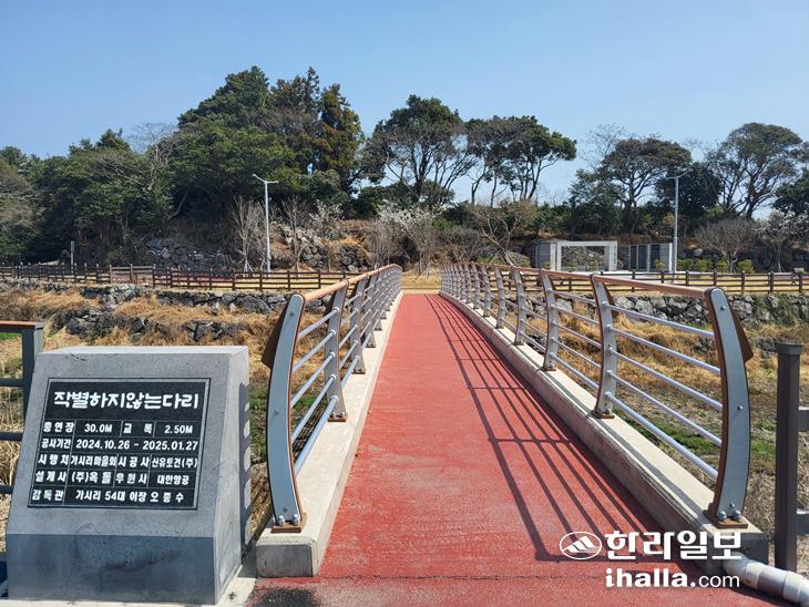 서귀포시 표선면 가시리 '작별하지 않는 다리'. 2025년 1월 준공된 시설로 한강 소설을 모티프로 명명됐다. 다리 건너편에는 2024년 12월 지역 주민들이 세운 '가시리4·3희생자위령비'가 있다. 진선희기자