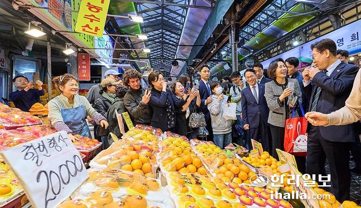 [한라일보] 이재명 대통령이 30일 제주시 도심에 위치한 전통시장인 제주동문시장을 깜짝 방문해 시민들과 만났다.
