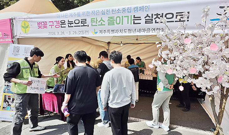 제주특별자치도청년새마을연합회(회장 장지웅)는 청년새마을연합회원 및 제주대학교새마을동아리 '고찌글라' 회원 36명이 참석한 가운데 지난 28일부터 29일까지 '더 나은 제주를 위한 작은 실천' 캠페인의 일환으로 제19회 전농로 왕벚꽃축제 부스에서 탄소중립 퀴즈를 통한 홍보 캠페인을 전개했다.