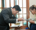 | 지난 2월 13일 '4·3 가족관계등록부 정정 결정문'을 고계순 할머니에게 전달한 오영훈 제주도지사와 김창범 제주4·3희생자유족회장. 제주도 제공 |