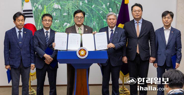 우원식 국회의장과 국회 내 정당 원내대표들이 31일 국회에서 열린 개헌 추진 관련 기자회견에서 각자 서명한 '대한민국 헌법 개정안 합의 서명부'와 '초당적 헌법개정 추진을 위한 국회 선언문'을 공개하고 있다. 연합뉴스